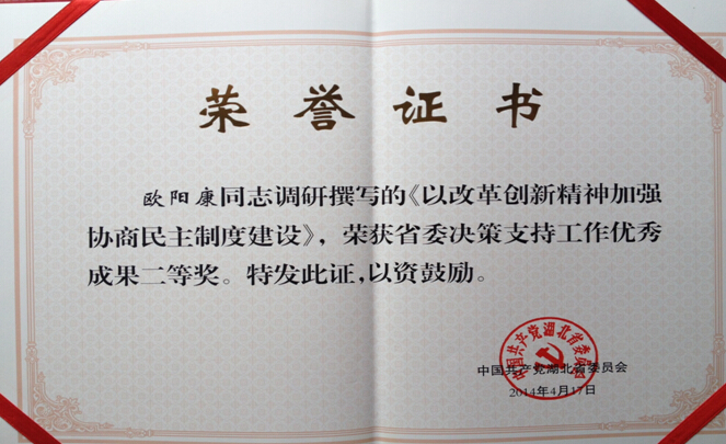 欧阳康2014年给湖北省政协会议的提案《以改革创新精神加强协商民主制度建设》在省政协联组讨论大会发言,被列为湖北省政协2014年重点提案,由范兴元常务副主席亲自督办;欧阳康被聘为湖北省全面深化改革领导小组政协和统战方面首席专家;欧阳康《以改革创新精神协商民主制度建设》被评为省委决策支持优秀成果二等奖。